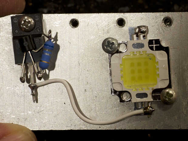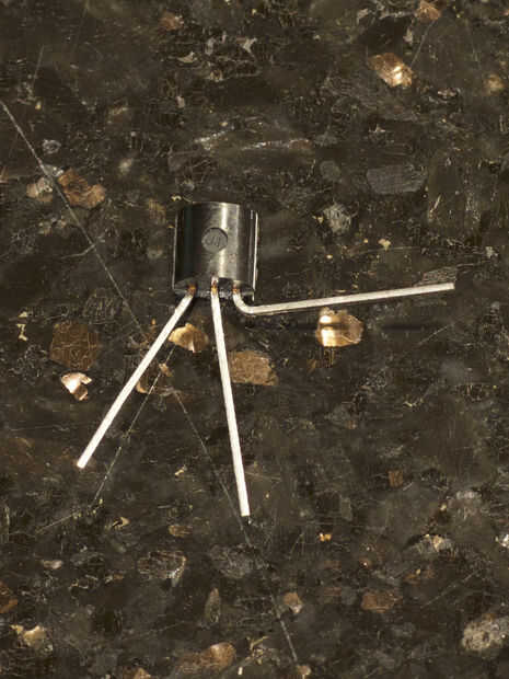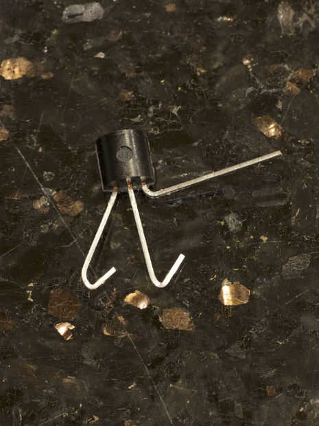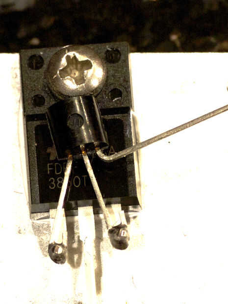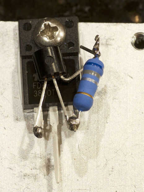 Monte el MOSFET en el disipador de calor con un tornillo 4-40. Luego doblar los dos exteriores conduce hasta dejar el recto de un medio. Establecer el lado plano del transistor y el conductor de la mano derecha en un ángulo de 90 grados de la curva. Ahora extensión los otros dos aparte lleva alrededor de 45 grados. Formar un lazo medio en ambos de estos conductores. Acople los lazos de dos cables de exterior en el MOSFET y soldadura. Conecte la resistencia de 75 ohmios a la mano derecha del MOSFET y el transistor que estaba doblado en un ángulo de 90 grados. Formar un círculo con algunos del cable de la resistencia restante. Se trata de la conexión a tierra.