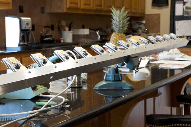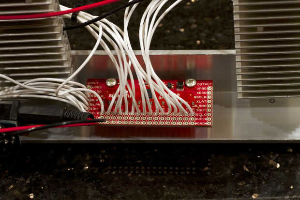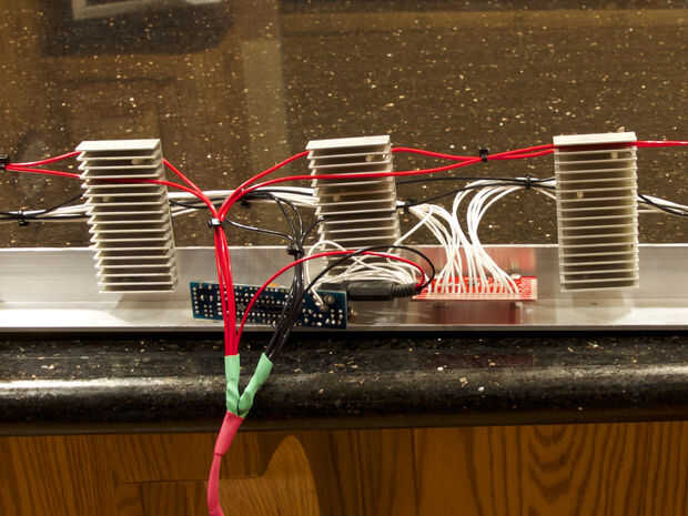 Utilicé tornillos 8-32 para los disipadores de calor para el aluminio de ángulo. Cuando se montan todas es hora de conectar cada cosa. Por el poder que dividido el los módulos en cuatro zonas. Yo por cable que los cables de positivo y tierra a cuatro módulos conectan los cables para los cuatro conjuntos juntos en un cruce. Usé un cable de calibre 18 para esto. Recuerde, cada LED puede consumir casi un amperio de corriente. Entonces conecté los cables de cuatro (y la potencia de la placa de circuito para un total de cinco) a un cable de 16 calibre que corrí a la fuente de alimentación.