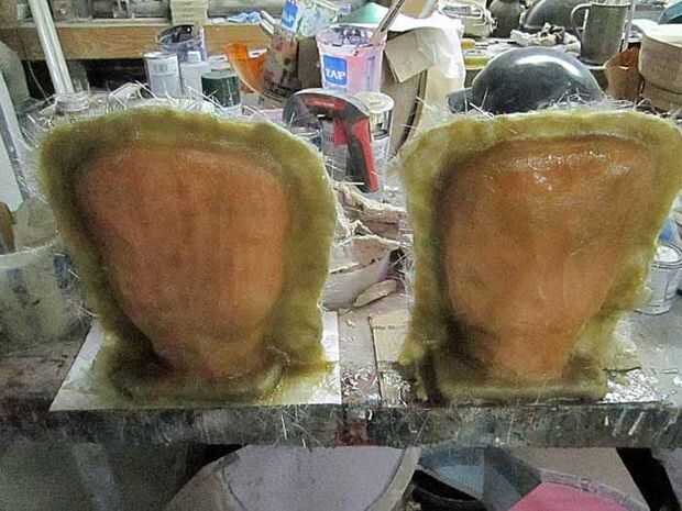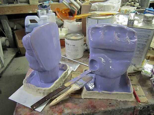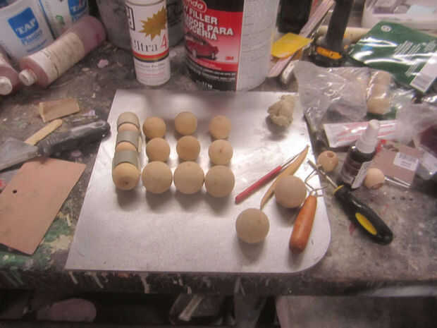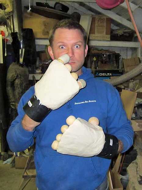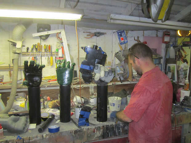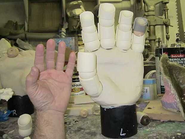 En este caso, que tenía que hacer manos gigantes y añadir un pie más o menos al alcance del usuario. Para lograr esto, esculpido hacia fuera un par de palmeras con arcilla a base de aceite. Luego fui adelante y esculpido nudillos individuales para cada una de las manos con más arcilla, así como algunas bolas de madera y trozos de tubo de PVC que tenía puesta alrededor. Entonces hice un molde de cada una de las piezas y útiles en uretano de la resina para hacerles hueco y ligero.