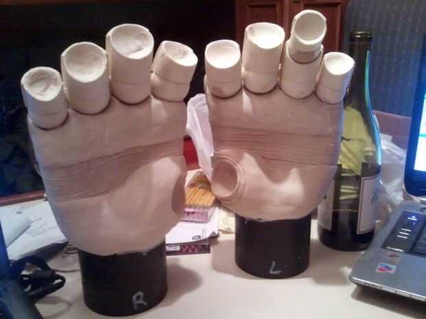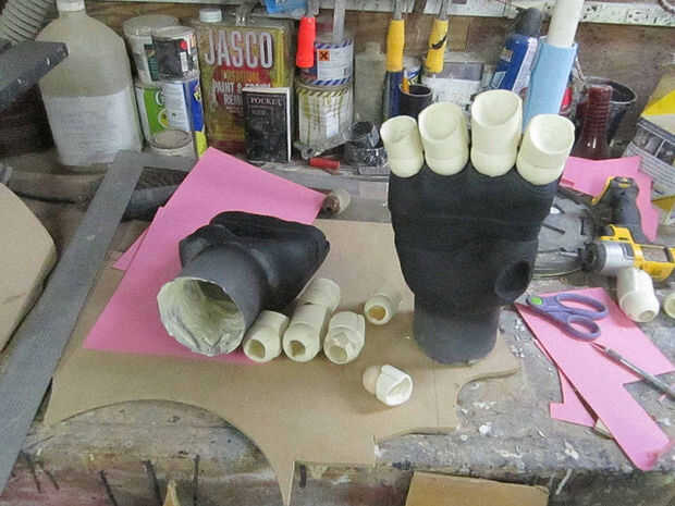 Una vez tuve castings alineados, era sólo una cuestión de elegir un gesto * y pegar las piezas de dedos en su lugar en las palmas. Para las manos que serían tener armas, tenía que construir los dedos alrededor de los puños. Las manos ensambladas luego estaban pegadas en el extremo de una pieza de 4" tubo de desagüe ABS con una manija interior. El tubo se deslice sobre el brazo del usuario dentro de antebrazo del traje y actuar como una especie de corsé para ayudar a los usuario a empuñar las armas y todo eso.