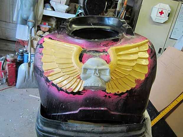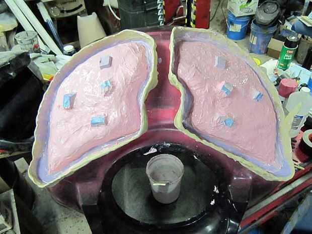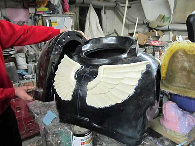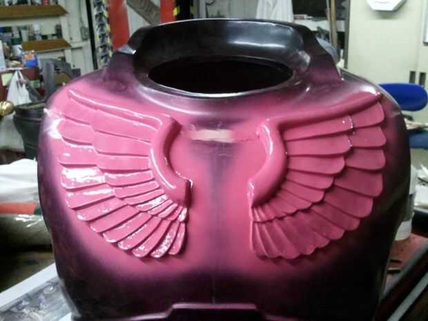 Ya que no quería esculpir las alas una y otra vez, una vez tuve una pareja con que fue feliz fui adelante y hacer un molde para poder lanzar copias y simplemente pegarlos en la armadura. Para diferenciar un traje de la siguiente, he hecho diferentes iconos en el centro de cada pecho después de fijar las alas. Utilizando un producto de masilla de epoxy llamado "Magic-Sculpt" pude crear una escultura única para cada uno que más tarde se endureció y se convirtió en por lo menos tan fuertes como las piezas de plástico resina y vacformed. El primero que esculpida fue una calavera, luego el águila bicéfala imperial y finalmente una espada con alas.