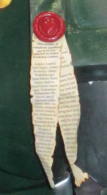 Las cintas que cuelgan de los sellos se suponen que son inscritos con letanías y conjuros sobre Victoria y valentía y devoción al emperador de toda la humanidad. En lugar de simultáneamente desarrollando mis habilidades de caligrafía y síndrome del túnel carpiano, opté por imprimir el texto con una impresora de inyección de tinta y algunas hojas de tela para imprimir imprimir tesoros, este material es una tela de algodón ligero con un soporte de papel adherido a él para que pueda ejecutar a través de su impresora. Una vez que se imprime, retire el soporte de papel y ya tienes un trozo de tela impresa sin embargo te gusta. Nifty bonito.