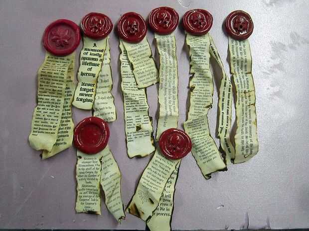 Para los sellos de pureza, empecé con algunos grumos de arcilla y empuja un objeto cilíndrico en ellos para dar la impresión de sellos de cera. En el centro de cada uno, me pegué un elemento encontrado para hacerlas cosas más interesantes (de una escultura de la calavera pequeña a uno de mis dispositivos de rango de la marina de guerra). Luego siguió adelante y hace un molde así que pude emitir copias de los mismos en resina.