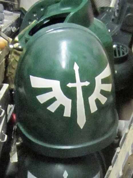 El primer paso de convertir todas las piezas de plástico grandes en integrantes del quinto Escuadrón táctico de la quinta compañía del capítulo de Ángeles oscuros de los Adeptus Astartes fue spraypaint. En este caso dio todo una capa base de "Caza del Club verde" por Rustoleum, luego volvieron sobre él con su mucho más ricos, un poco más ligeras "Hunter Green." Esto dio cierta profundidad adicional al color y comenzó el proceso de envejecimiento.