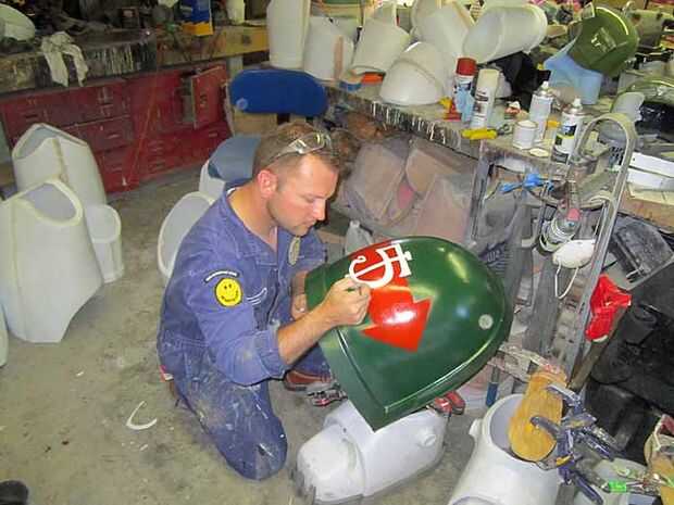Hice tres tales plantillas: el logo del capítulo de hombro izquierdo, la doble flecha roja para el hombro derecho y el blanco numeral 5 por el hombro derecho. El rojo fue una combinación de "Rojo Colonial" y "Paprika" en diferentes brillos para que se vea un poco viejos y descoloridos. El blanco era "Shell blanco" que debería llamarse "Hueso blanco" pero algún grupo marketing probablemente decidió que era demasiado miedo para la gente a comprarlo. Después de las plantillas fueron rociadas con sus respectivos colores, he decidido que todavía necesitaban un poco de retoque con el pincel de un artista pequeño.