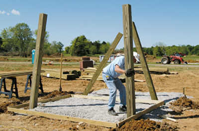 Esta vertiente del encapsulamiento es anclada por una media docena, concreted 6 x 6 pulgadas entradas (cuatro esquinas y dos para la proyección). Las paredes del galpón son 8 pies de altura. Añadir longitud adicional equivalente a la profundidad de los agujeros. Recuerde a hundirse por debajo de la línea de congelamiento. Los agujeros deben ser dos veces tan anchos como el post.