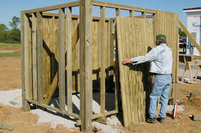 Paredes de stud se hacen de 2 x 4 pulgadas de madera tratada en centros de 16 pulgadas. Estructura de las aberturas ásperas para las ventanas y la puerta. Las paredes se unen a los puestos y el nivel en la parte inferior. Espacio en la parte inferior de la pared está lleno de piedra caliza triturada. Revestimiento T-111 se utiliza para cubrir la nave.