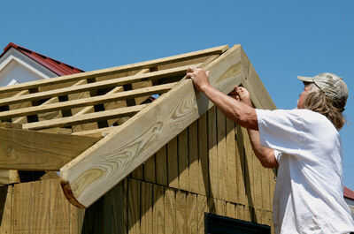 Dos-x 8 pulgadas facia juntas se unen a los bordes del techo. Observe que hay algunas irregularidades de las costuras que unen piezas de T-111. Esto no es inusual. Las costuras están cubiertas más tarde con piezas de 1-x tableros corte 4 pulgadas.