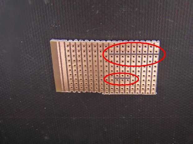 Basta con cortar dos líneas a través de las pistas de la veroboard como se muestra en la foto. Esto es donde se suelda el microcontrolador y las resistencias a.