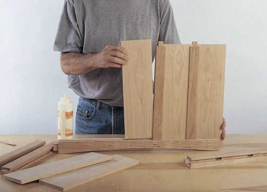 Los paneles de la arena antes de ensamblar los lados y la espalda. Aplique pegamento en las juntas de mortaja y espiga de la posterior Asamblea, teniendo cuidado de no para tener pegamento en las ranuras del panel. Instale los paneles y montantes en el riel inferior (Foto 2) y luego coloque el riel superior y use abrazaderas para tensar las articulaciones. Después del montaje de los lados de la misma manera, unir las piernas a los extremos del riel lateral. Cuando el pegamento ha fijado, Únete a las Asambleas de lado al frente y rieles.