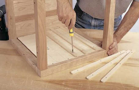 Cortar la madera contrachapada interiores lados tamaño, diámetro y avellanar agujeros y atornillar los lados interiores para las piernas. Coloque la ubicación de las tiras de la guía de cajón y cortar las tiras a la medida. La forma más fácil de hacer estas tiras es primera derrota un perfil nariz de toro a lo largo del final de una tabla de ancho. Entonces, rasgar las tiras de la placa, corte a la longitud y atorníllelos en su lugar (Foto 3).