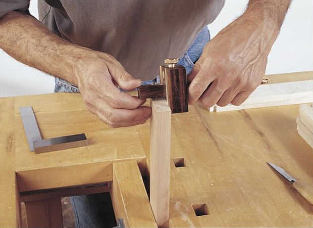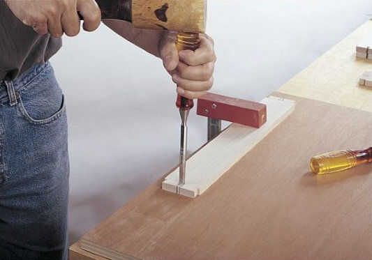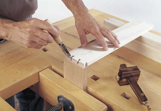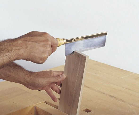 Con las colas definidas por los cortes de sierra, sacar la basura entre ellos alternando los cortes verticales y horizontales con un cincel (Foto 2). Estancia de 1⁄32 de pulgada desde la línea de cola de Milano de fondo hasta retirar los residuos. Por último, cortar precisamente a lo largo de las líneas de diseño, teniendo cuidado de mantener la Plaza de cortes en la cara de la Junta.