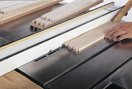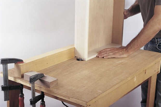 Cuando el pegamento ha fijado en todos los cajones, arena o plano de alisar las superficies exteriores. Utilice una broca recta de 3⁄4 pulg. de diámetro en la mesa de la fresadora para cortar ranuras en los lados del cajón para la guía de las tiras (foto 4).