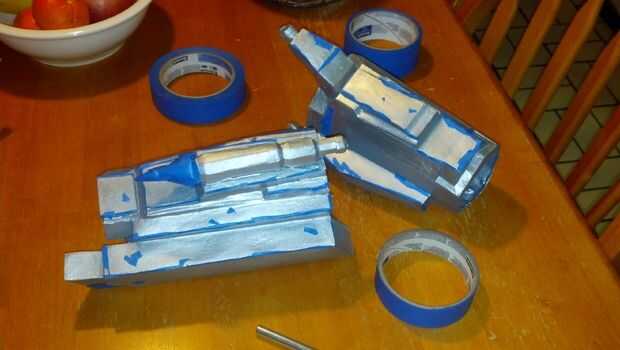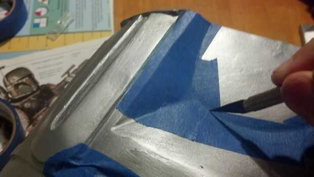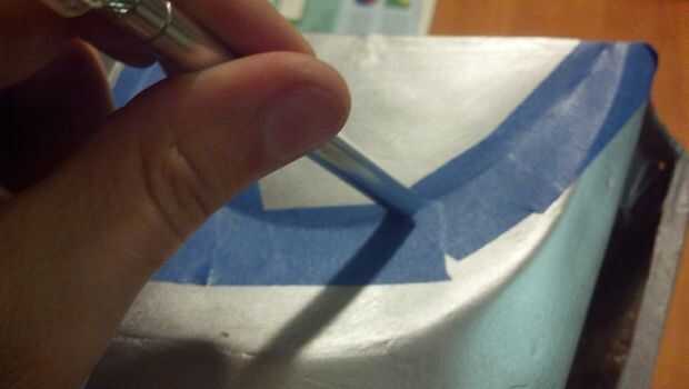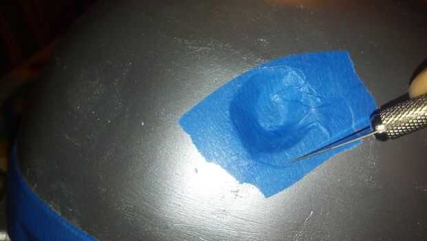 Para otras piezas, corte los bordes para dar la impresión de un antiguo trabajo de pintura que ha usado en los bordes de la máscara. Corte una tira de cinta adhesiva, pegue a un borde de la mesa y cortarlo en tiras delgadas a lo largo con un cuchillo X-acto. Utilizar estas tiras a lo largo de los bordes. Máscara de fichas al azar y raspaduras alrededor de cada parte.