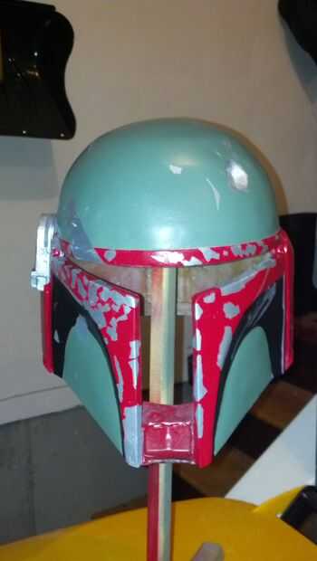 El casco requiere un poco más trabajo. Enmascare la verde, incluyendo la cúpula, hacia atrás y las mejillas. Desenmascarar la cara (la parte que rodea la pantalla) para exponer la plata. Asegúrese de que todavía hay algunos puntos de daño de batalla enmascarados apagado con pedacitos de cinta. Si es necesario, añadir unos cuantos más puntos y barras con trozos y tiras de la cinta. Ahora, rocíe la cara roja. Desenmascarar la parte de la cara que los ángulos hacia las placas de la mejilla y spray negro, agregando otra vez daño de batalla si es necesario. Enmascare todo pero los auriculares y rociarlas amarillo. La base telémetro debe ser rojo. Por último, quitar el polvo con negro y cinta adhesiva todos.