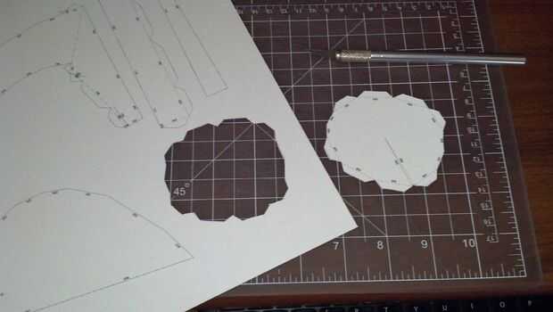 Después de cada pieza se corta, marcar y doblar las líneas de puntos. Las líneas pueden anotó trazando ligeramente con el cuchillo X-acto. Las líneas punteadas son "pliegues de la montaña", donde el papel forma una "montaña" cuando se colocan sobre una superficie plana con los números hacia arriba. Líneas de guión y punto con dibujos son "pliegues de Valle".