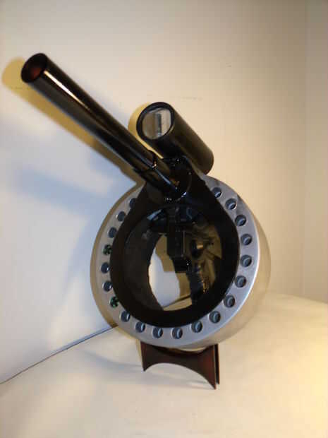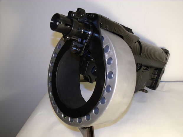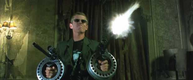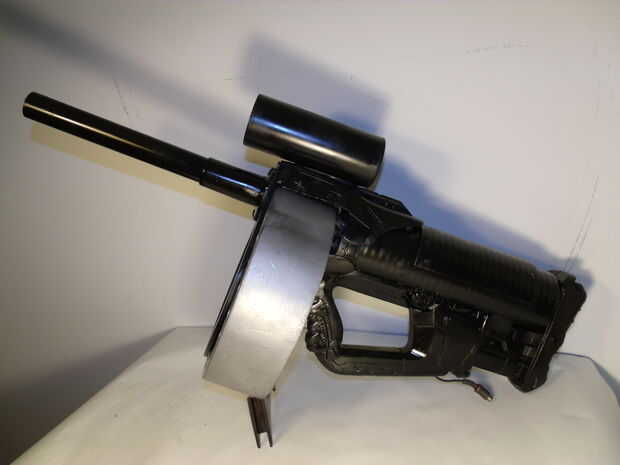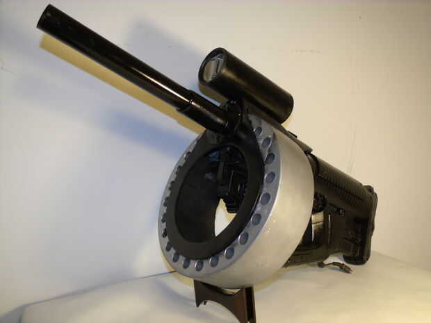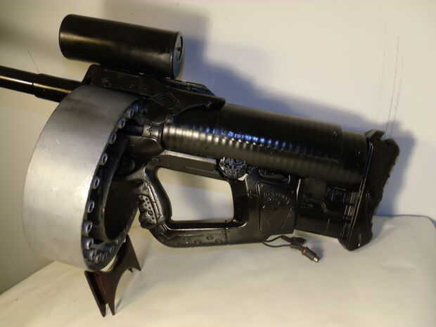 Estas armas fueron encargo construido para esta película por John Bowring, un constructor de armas usadas en las películas. Si alguna vez has visto una pistola de película que te hace decir "wow, eso es cool...", lo más probable es este chico lo construyó. Se trata de cam impulsado, Ronda 25, tambor rotatorio, escopetas automáticas. Lo que esto significa (estoy bastante seguro de todas maneras) es que el gatillo activa un motor situado en la parte superior de la pistola, que da vuelta el tambor. Detrás del tambor es un resorte percutor que golpea cada cáscara de la escopeta como el tambor gira. Tasa de disparo se determina por la velocidad de los motores que hacen de los tambores. El genio de estos cañones, además de cómo ellos miran impresionante, es la sencillez de todo el sistema. Nuestras versiones de estas armas son, en comparación, mucho más complicado; pero como puedes ver, muy capaz de hacer y vale la pena el tiempo invertido para construirlos.