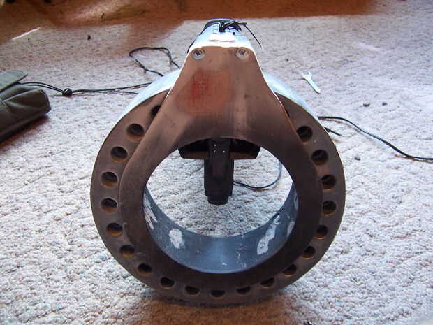 Cuando estás bastante seguro de su medición, dibuja un círculo en un pedazo de madera contrachapada de 1/4". Ahora, en la parte superior de ese círculo, dibujar un triángulo muy grande. Esta corte y, con el tambor de su arma, mantener hasta la parte delantera. ¿Superponga ligeramente su tambor, pero no la bala? ¿Es el triángulo suficientemente grande como para cubrir la parte delantera de la cáscara de la luciérnaga? Cuando se puede decir sí a estas preguntas, dibujar un segundo círculo alrededor de una pulgada más pequeño en diámetro en esta pieza y recortarlo. Usted debe terminar con un anillo de 8" con un triángulo grande en la parte superior.