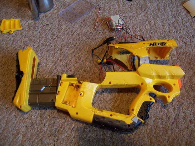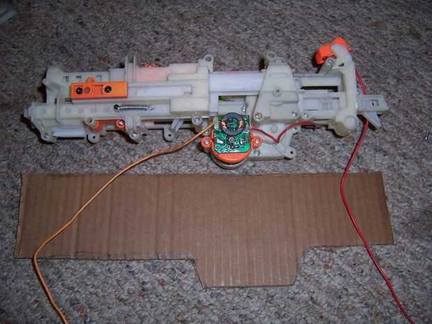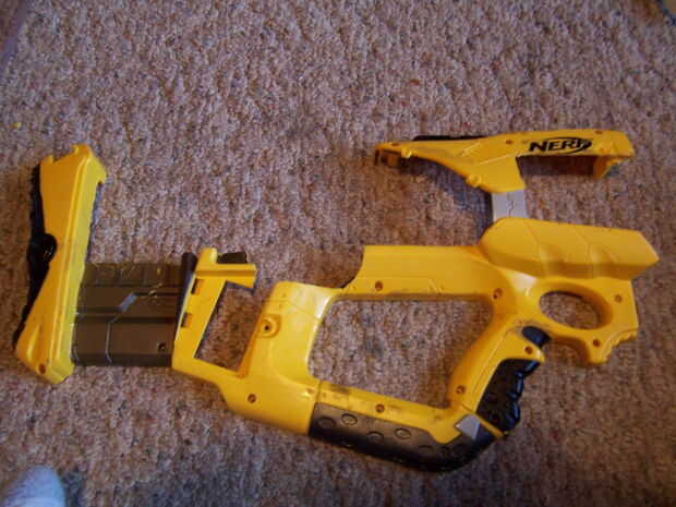 Ahora viene la parte de miedo, a fin de poder incorporar las piezas de la Vulcan, tenemos que recortar una parte importante del cuerpo de la luciérnaga. Fue difícil para mí hacerlo, pensé, "No puedo creer que estoy destruyendo una perfectamente buena pistola de Nerf". Tiene que hacer aunque, así que toma una respiración profunda y exhala. Todo va a estar bien.