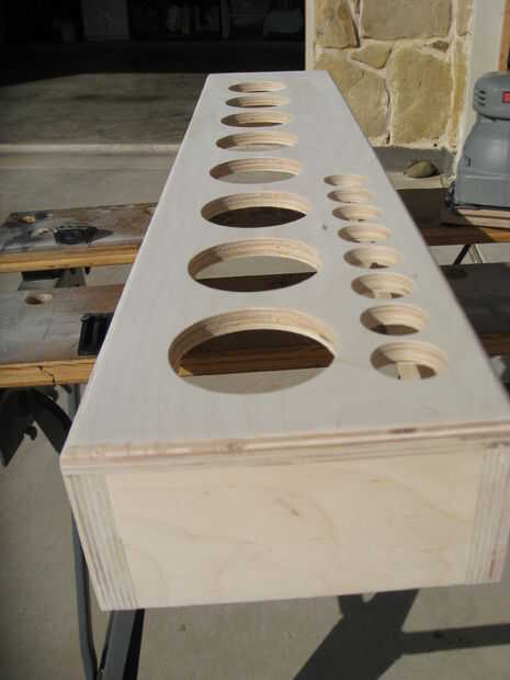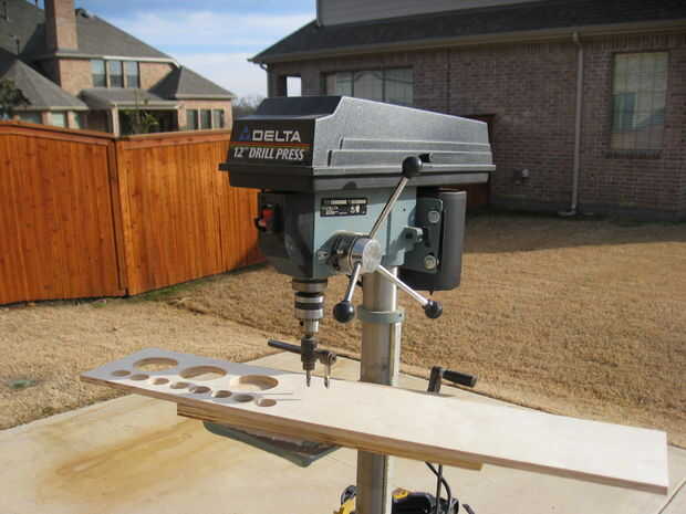 Después de cortar todas las piezas hacia fuera con una mesa vieron que configurar mi taladro para moverse el panel delantero mientras que mantiene la distancia correcta desde el lado del panel frontal. Par de abrazaderas y algunos restos de madera son todo lo que necesitas. De esta forma si estaba apagado un poco los controladores todos se alinean y parece buena. Entonces midió apagado todos los centros de los agujeros y procedió a perforar lejos. Después de terminar los agujeros he redondeado en la parte frontal con un router y luego lijar todas las piezas. Antes de poner el taladro en prensa, necesita recorte un agujero en la parte trasera para el conector del altavoz. La que he utilizado convenientemente es necesario un recorte de 3" agujero. También, perforar agujeros en la parte trasera para los tornillos que se usan para montar al recinto antes de lijar, coloración y barnizado.
