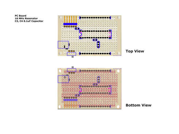 Y condensadores de dos 0.1uF (C3, C4), como se ve en el diagrama siguiente. Puesto que los condensadores no tienen la polaridad, nos podemos soldarlos en inmediato. Luego cortar las patas con corte Diagonal.