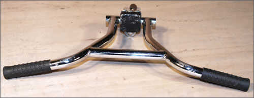 Un par de altura manillar de BMX estilo probablemente funcionará mejor para este proyecto, se requiere una pequeña altura en lugar de tener que doblar para dirigir. Figura 13 muestra un conjunto típico de 8 pulgadas de altura de manillar de BMX y un cuello de cisne que empareja para mantenerlos. También nota que cuellos de cisne vienen en dos tamaños, y aunque el goosneck de tamaño más grande no cabrá en el vástago de la horquilla más pequeño tamaño, el cuello de cisne más pequeño hecho encaja el vástago de la horquilla más grande, pero será finalmente trabajar su camino libre o caerse. Esto es más malo por el Comité secreto no estándares, así que ten cuidado. No debe haber ningún juego entre el tubo de cuello de cisne y el vástago de la horquilla.