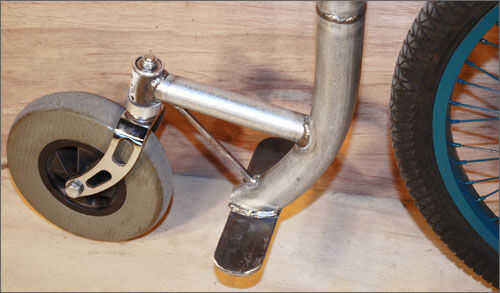 El estribo manillar plano aparece instalado en la figura 15 después de redondeo de los filos con un disco de amoladora y un disco de lija. Manillar plano pie peg opción funcionado hacia fuera mejor que las estriberas BMX, como mantenía mis pies más cerca al suelo, haciéndolo más fácil de llegar a y la tierra para la aceleración del retroceso.