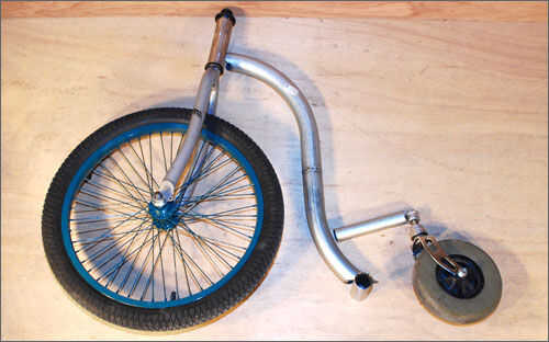 La figura 7 muestra el grado de mi plan. Lugar las piezas en el suelo y llenar los espacios en blanco. Quería que mis pies que sólo unas pocas pulgadas de la tierra para que sea fácil de operar la unidad como un patinete estándar, por lo que las clavijas se colocaron para permitir una separación de tierra de 3 pulgadas, lo suficiente para evitar raspar el suelo durante las vueltas y curvas cerradas. Observe también cómo el tubo frontal de la cabeza está en ángulo ligeramente hacia adelante mientras que el de atras tiene un ángulo ligeramente hacia atrás. Este ángulo de caster de 10-15 grados permite controlar más estable al tratar de moverse en línea recta.