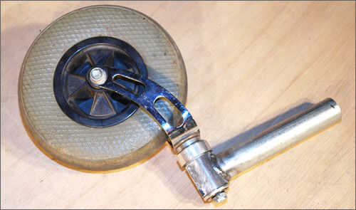 Para participar en la rueda de atras a la estructura, un tubo pequeño de 1 pulgada del conducto fue cortado a una longitud de 8 pulgadas y soldado al tubo de la rueda pequeña. Si está utilizando una rueda de carro comercial, entonces tendrá un perno, no un tubo y requerirá un agujero para montar a su tubo de marco. Un pedazo de manillar plano o ángulo de hierro también funcionaría para el montaje de un echador de perno estilo a su scooter.