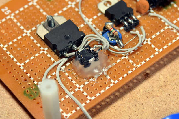 Ahora, perfore un agujero, hotglue un conmutador de pulsador y soldadura al circuito dimmer.
