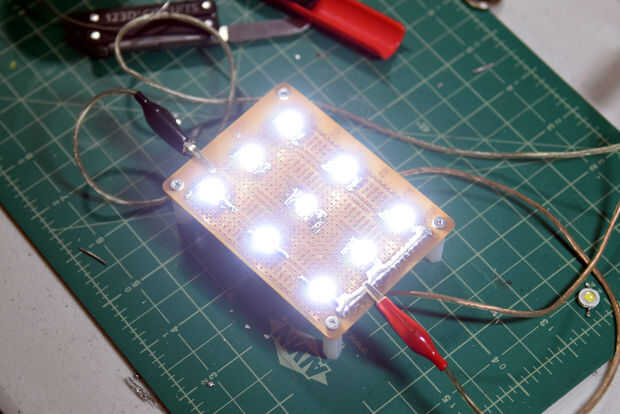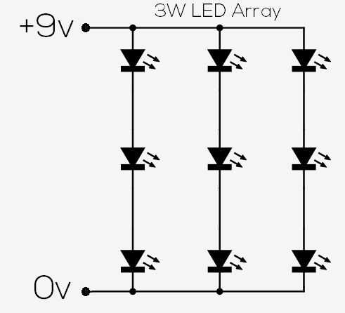 Suministrar una fuente de alimentación de 9v a la matriz de LED. En relación con el calor, los LEDs calientan mucho en 9v (máximo brillo). 6-7 voltios el LED apenas disipa el calor, la placa absorbe el poco calor que desprende. Línea de fondo, nunca utilice esta configuración en su máximo, solamente sintonizarla en la mitad del brillo. Por cierto, la mitad es todavía brillante, más brillante que su videolight promedio.