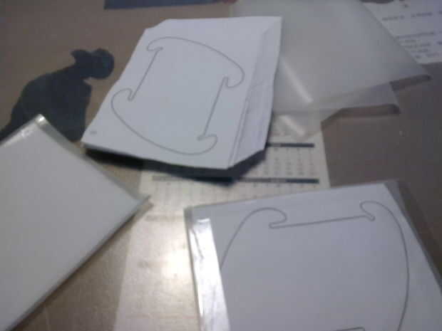 Imprimir la plantilla y corte en aproximadamente el mismo tamaño como la materia prima que usted corta de la L 2 botella de cartón de leche. Esta imagen se muestran algunas de las hojas sueltas de material plástico y una cubierta de la plantilla impresión en papel para ser palillo sobre el plástico golpeando abajo de 4 lados utilizando cinta adhesiva.