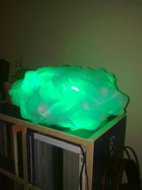 Puse la luz LED de cadena dentro de la lámpara iq y poner el final 5 forma junto con la cerradura de alambre en su lugar en el centro de la articulación 5 ganchos. La bola de luz led está colgando en el centro de la lámpara iq. El LED generan muy poco calor y la sombra en realidad no es hermético y si hay calor, puede ventilar de todos los huecos de la pantalla.