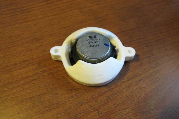 Las carcasas de altavoz están diseñadas para ser un ajuste muy apretado y esencialmente snap en el altavoz ya que hayan no hay ubicaciones de los tornillos o puntos de fácil conectados al altavoz. Para sujetar el montaje, coloque la cara del altavoz hacia abajo sobre la mesa y baje el soporte de plástico suave y firmemente sobre ella hasta que ambos lados encajen en su lugar. Aunque los montajes son rígidos, lo último que desea es algo para soltarse. Recomiendo pegar los altavoces en el soporte plástico usando un epoxi de dos componentes. El mejor lugar para pegar es la parte superior donde las dos alas con las muescas del altavoz. Tenga cuidado de que ninguno de la cola o goteos en el altavoz o en la mesa y luego en el altavoz diafragma o se arruinará.