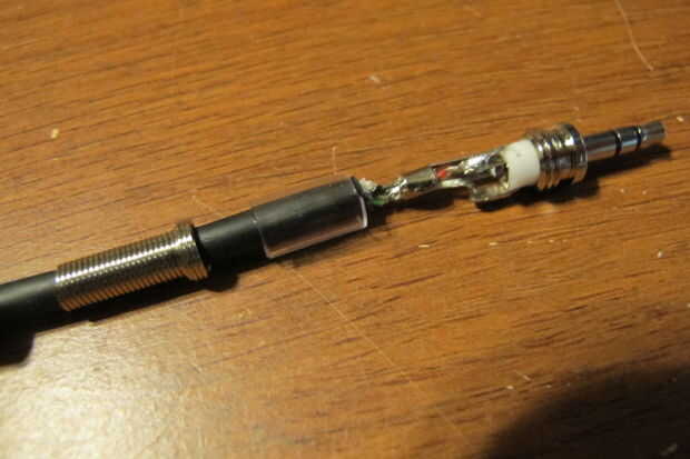 La parte más delicada es el cableado hasta la toma de auriculares de 3,5 mm. El alivio de tensión metal apenas se coloca sobre el alambre en espiral y es difícil de diapositiva alrededor (que es una buena cosa). En cuanto a la soldadura, las conexiones son pequeñas y sería más fácil con una tercera mano para mantener todo en su lugar. No te olvides de Deslice todos los tres pedazos de la cubierta hacia arriba en el cable en el orden correcto antes de comenzar o tendrá la oportunidad de intentarlo de nuevo.