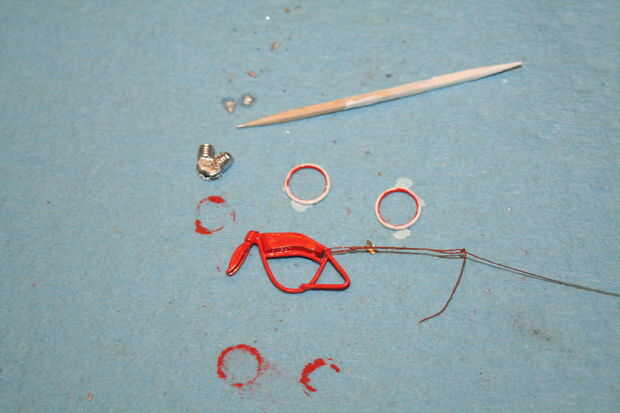 Pintar algo tan pequeño puede ser un dolor real. Traté de pintura en aerosol-que no tan bien. Sólo lo hizo saltar por todo el lugar y no pude conseguir una capa uniforme. Entrar en la pintura de modelo de probadores. Usando un conjunto extra fino de los pinceles de la sección de fabricación en Walmart local, pude obtener una buena capa uniforme en el marco y piezas. Palillos de dientes también funcionan muy bien para detalles muy finos como las llantas. Se realizaron por fuera blanco, el naranja de los interiores, la pintura y el muy cuidadosamente con un palillo retocar cualquier "overspray". Como se verá en el cierre para arriba fotos, hay un margen de mejora aquí.