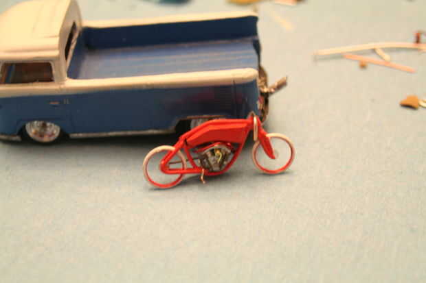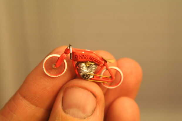 El toque final fue el tanque calcomanía-esto fue impresa en papel de transferencia de agua clara. Tomó varios intentos en papel normal para obtener el tamaño y la curva derecha. Una vez que fue descubierto, fue impreso en el papel de transferencia de agua, sellado con un fixativ, cortar y empapado. Palillos de dientes se utilizaron para slide de la calcomanía de soporte sobre la bici.