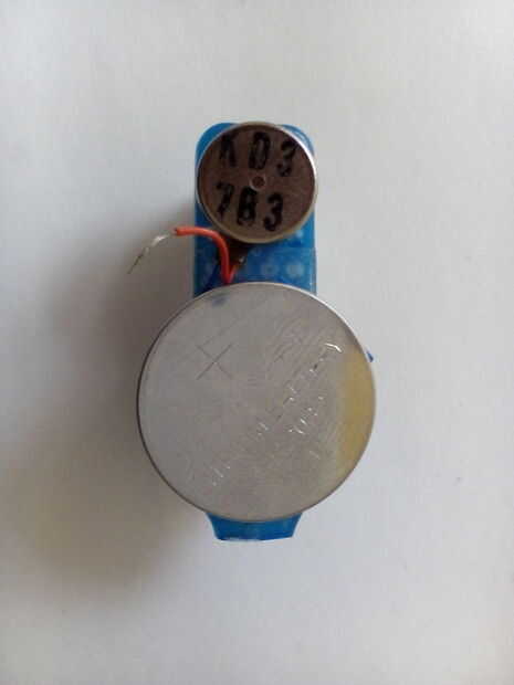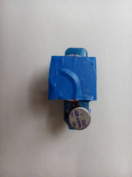 A continuación, conecte la batería. Utilice cinta aislante para unir los dos cables del motor, uno para cada cara de la batería. Sabes cuando tienes una buena conexión, el motor será la primavera en la vida! Tratar de conseguir la cinta ajustada a través de la batería para asegurarse de que los cables no resbalen - si uno de los cables está flojo, el bristlebot se mantenga parada!
