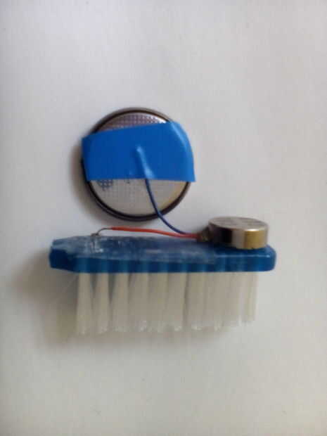 Una vez que los cables estén firmemente sujetos, puede pegar la batería hacia abajo en la parte superior del cepillo. No intentar pegarlo abajo demasiado ladeado, como si el peso se desplaza demasiado hacia un lado o el otro, su bristlebot seguirán cayendo. Bueno para una charla sobre centros de gravedad, pero no lo que queremos para nuestro bristlebots!