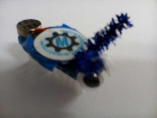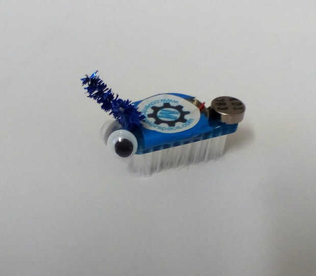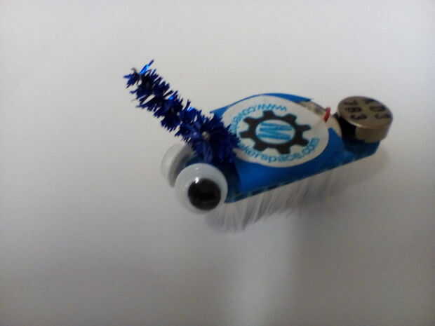 Una vez que ha conectado la batería, su siguiente trabajo es decorar tu bristlebot! Elegimos añadir antenas, ojos saltones y una pegatina de Coventry Makerspace para rematar nuestro. Durante el día, vimos algunos diseños muy extravagantes (y muy impresionantes), con un montón de robots Cíclope, tallos del ojo y patas muchos bichos! Divertirse, pero recuerda que nada que añade potencialmente afectan a cómo se mueve tu bristlebot.