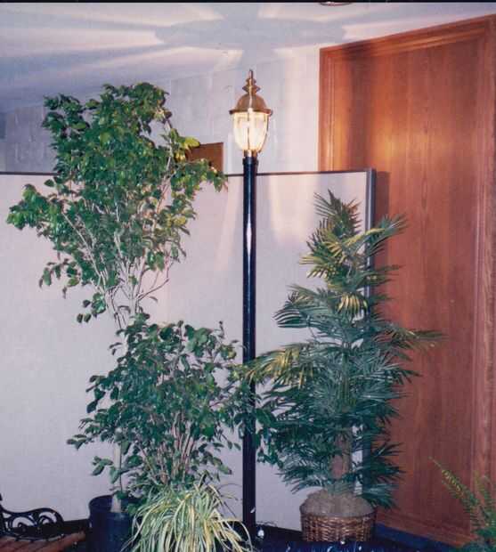 Hace muchos años un amigo me pidió que decorar para su recepción de la boda. Tenía libre acceso a una sala de reunión de la iglesia, pero quería cambiar por completo el ambiente interior por lo que se trataba de algo muy diferente. Acordamos para convertirla en un parque de la ciudad por la noche. Los principales componentes de esta transformación fueron luces de parque y zonas verdes (árboles, arbustos y flores). Tomé el reto de hacer 10 parque como 'luces de la calle'.