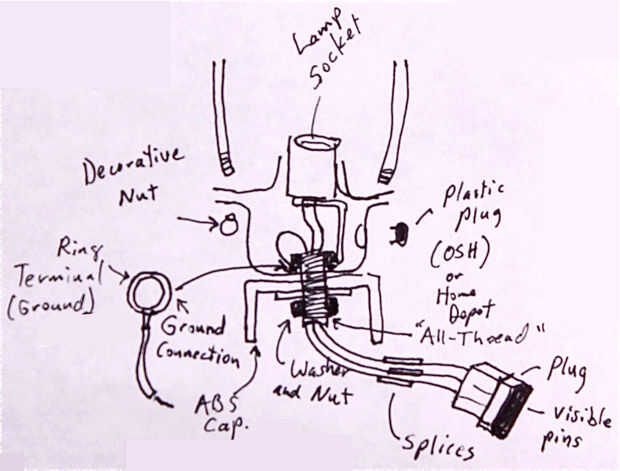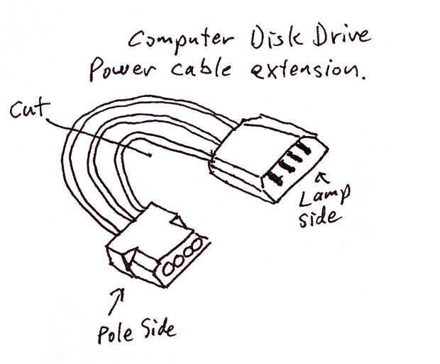 Los farolillos que se necesitan montar y desmontar para el transporte. Los faroles en la parte superior deben ser capaces de ser desconectado eléctricamente para que las unidades pueden desmontarse. La manera más barata de conseguir acoplar conectores eléctricos para mí era canibalizar cables de extensión de disco de computadora que tenía. Los cables de extensión del equipo de trabajo bien porque ellos son polarizadas (afinado) para que acoplarán entre sí solamente unidireccional; el cableado no se mezclan y conectado correctamente durante el montaje. Los cables de extensión tienen un enchufe macho y hembra, conectado entre sí por una longitud corta del alambre. El cable es cortado en dos, y el hombre (ha empotrado alfileres en ella) está conectado a los cables en la linterna y la hembra (ha empotrado apareamiento 'tubos' / tomas) son empalmados los cables en los cables en el poste de la lámpara. Se conectan los cables hacia atrás pelando el aislamiento, deslizarse en algunos (encontré algunas claro) la tubería del encogimiento del calor, torciendo juntos los cables, soldar y luego deslizarse el calor retráctil en posición y achicando con una pistola de calor o la antorcha de la llama.