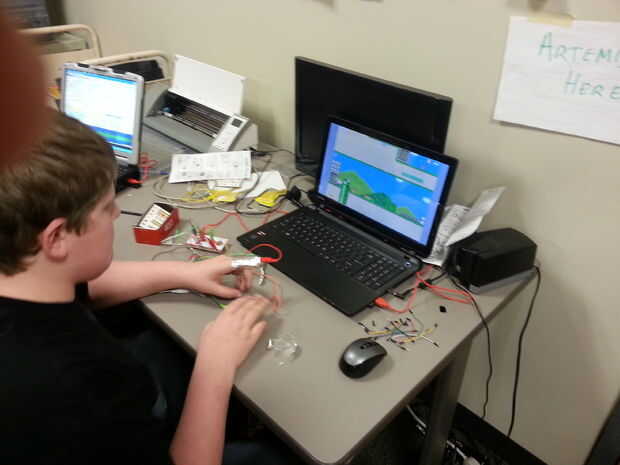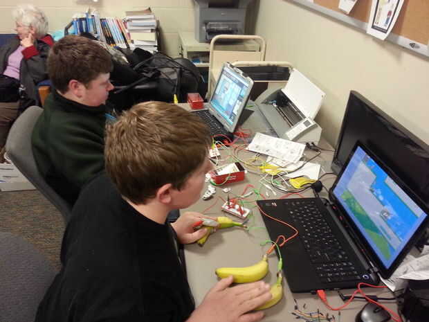 y pensar que estábamos en la ciudad de grasa. Luego nuestro tiempo se convirtió en una realidad. Nuestras primeras dos noches MakeyMakey construcción programadas, fueron canceladas por el Condado debido a "black ice" y 4 pulgadas de nieve. El tercer intento programar una noche construir también parecía condenado a la intemperie pero en el último minuto nieve cambió a lluvia y son apagado y funcionamiento. Problema era que la asistencia fue mucho menor de lo habitual debido a las preocupaciones de seguridad. Así que no nos la oportunidad de hacer cualquier proyecto real "gee-wiz"..."outta techno-vista". Tenemos 8 niños que fueron en su mayoría menores de 11 demuestran para arriba. Comenzamos con la demo de pianos de plátano generalmente para conseguir cosas. Tenían diversión hacer un piano de 6 niño donde cada estudiante fue atado con alambre a una función de pulsación de tecla con un niño, el "jugador" conectada a tierra. Haciendo alto cincos o golpes de puño podrían jugar melodías crudos. Pero otra vez, no gee-wiz! Un par de niños mayores demostró para arriba y armar algunos juegos 2D controlados por manos por cable o "teclados" hechos de hoja de lata configurar en el piso. Y al mismo tiempo interesante al principio, que consiguió viejo rápido así. Y nadie pensó que merecía una mención de Instructables.