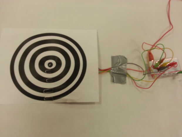 En nuestros primeros intentos, atamos clips de papel para cada anillo de puntuación corte una raja en un anillo y un clip de papel con cuidado de mantener el clip sólo en el área con grafito. Luego recorta los cocodrilos incluido a los clips que sobresale de la parte posterior de los objetivos y fijarse al MakeyMakey. La teoría era que sería colocar una muy pequeña 24 AWG alambre trenzado 1" Play-doh pelota, caer, se conecte al destino y anotar el tiro basado en el tono generado en Soundplant usando el mapa de teclado adecuado. Otra vez un buen aprendizaje. El cable, no importa cuánta holgura incluido, siempre "perturbada" la gota de la bola y anotar, de una altura de 6', llegó a ser difícil. Ser consciente del concepto de la utilización de nuestro armamento Medieval en el futuro construir noche un estudiante esfuerzos sugirió modificar el destino poniendo bandas muy finas de grafito entre los anillos de puntuación que se conectaría directamente a tierra MakeyMakey. Hicimos esto presionando alfileres de coser a través de los anillos, los pines en un ángulo de flexión y luego les recorte todos juntos y a la placa de tierra MakeyMakey. Las distancias entre las líneas de grafito eran tales que la bola cayó cubierto fácilmente un anillo de puntuación y un anillo de tierra que permite la correcta caída y puntuación.