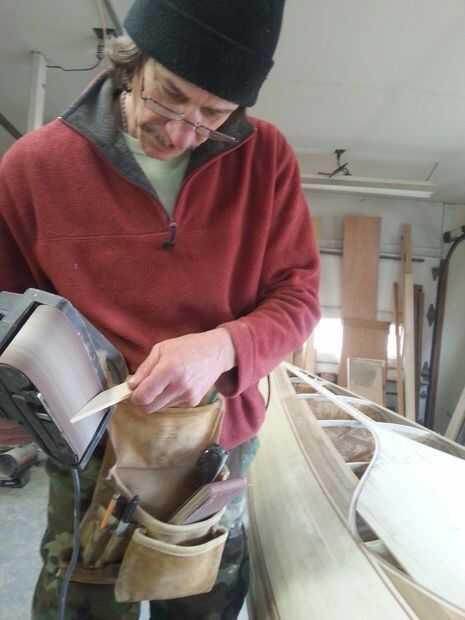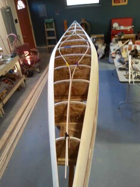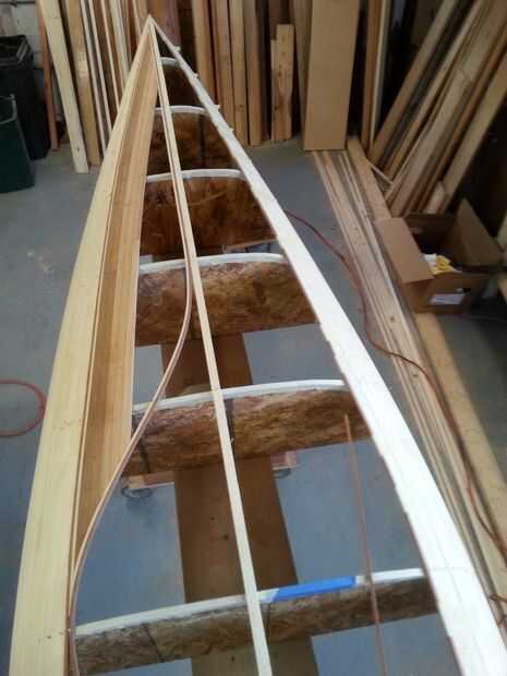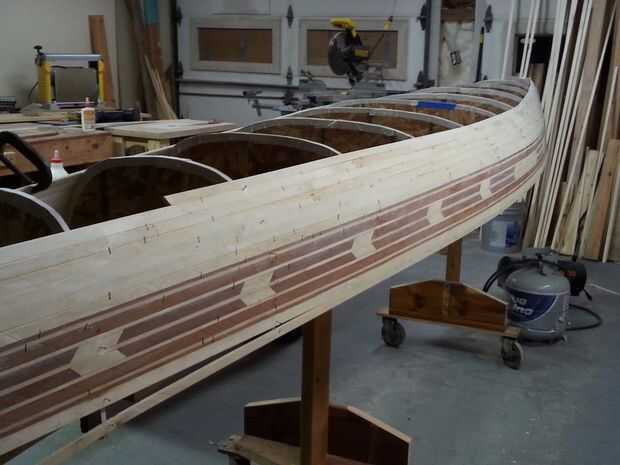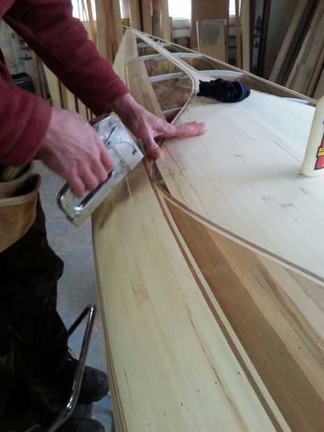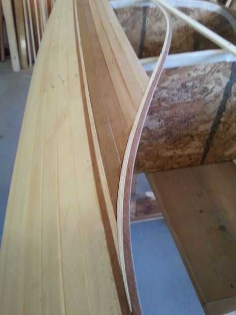 Pelar el casco básico fue rápido, creo que me había tomado una semana para llegar a la parte inferior de la embarcación (parte superior de la parte posterior fuerte). Corro dos tiras de cada lado y alternativo. Cuando llegué a la parte inferior, me di cuenta de debo haber sido demasiado exigente cortando 'defectos' en la madera, no tengo suficiente aspen para completar la parte inferior. La madera blanca es 10 año viejo de especie incierta, por lo que no podía solo correr hasta la yarda local de la madera y hacer coincidir, así que una vez más necesito un relleno, tuve que cambiar a una diversa madera sin él mirando como corrí fuera de la madera, tenía que ser artística.