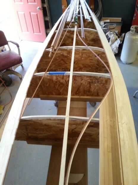 La raya al lado que creo está formada por 11 listones de madera que ocupan unos 5". El 1/4 y 3/4 tiras se aplicaron a casco uno a la vez. Extracción era bastante sencillo. Pegamento para madera Titebond, original está bien, no necesitas para el pegamento de la prueba del agua, después de la fibra de vidrio y epoxi, agua nunca tocará tu hermoso barco de madera. Ejecuto la primera franja horizontal perfecto al máximo. Asegúrese de poner el lado de Ensenada, que le da un pequeño canal a gastarse su grano del pegamento en sin él funcionando todo el barco. Usé grapas para sujetar mis tiras en su lugar hasta que el pegamento seca. Pongo en cada estación y en el medio donde se necesita.