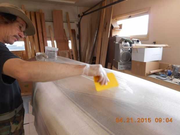 Trazar el vidrio es directo, que utilizo un pincel ancho desechable para pulirla, fibra de vidrio huecos fácil, por lo que no uso mis manos. Nota al margen, los cepillos desechables comprar a granel en la tienda de la caja grande. Uso un montón de pinceles en la construcción. Los desechables son todos que utilizar en todo el proyecto, soy un pintor de oficio, por lo que sé cuando un $15 que Purdy se necesita, 10 desechables cepillos, usarlos una vez y la tirada em. Sólo tienes que asegurarse de que hay no las cerdas sueltas, tirar de las cerdas antes de usar ellos, uno o dos se todavía salir a tu trabajo, solo les escojan, tienes que lijar entre no capas de todos modos, es gran cosa. La última capa de barniz consideraría una brocha de calidad, pero yo de pintura y barniz para ganarse la vida, me siento cómodo con desechables.