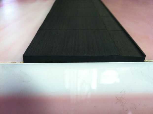 Ya no tengo el especial de hoja de sierra para cortar las ranuras de los trastes, originalmente planeaba LMII máquina el radio y el diapasón de la ranura. Sin embargo, yo había estado hablando con un amigo mío, Tim de guitarras Mcknight, que ya había hecho un accesorio para poder cortar las ranuras de mi diapasón. Puesto que tenía la hoja de sierra especial y ofrecido cortar las ranuras en el diapasón, después de la Junta, lo llevé a él en el espacio. Se trata de una escala de 35", diapasón de 22 trastes.