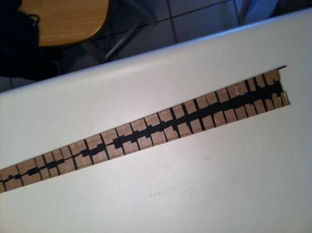 Diapasón pegado: Entonces, había pegado por el diapasón y utiliza cinta de fijación para mantenerlo todo junto. Había tomado una navaja y la punta de la cuchilla el mismo ancho de la tierra como las ranuras de los trastes para la limpieza de las ranuras. Colocado la cinta de fijación para no obstruir las ranuras de los trastes; así que cuando pegué el filete y la Unión, podría limpiar hacia fuera cualquier exceso de pegamento en las ranuras de los trastes.
