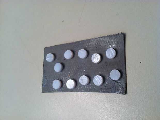 Punto de FINGERBOARD lija: Marca la posición de los puntos de incrustación y un taladro piloto poner los agujeros en el diapasón. Durante la perforación ¡ seguí revisando la profundidad con el extremo posterior de la pinza digital hasta que conseguí los orificios alrededor de. 015" menor que el grosor del punto. El siguiente paso fue utilizar pegamento CA e instalar los puntos. Luego utiliza mi 3 X 3 lijado bloque radio y lijar los puntos abajo a ras con el diapasón.